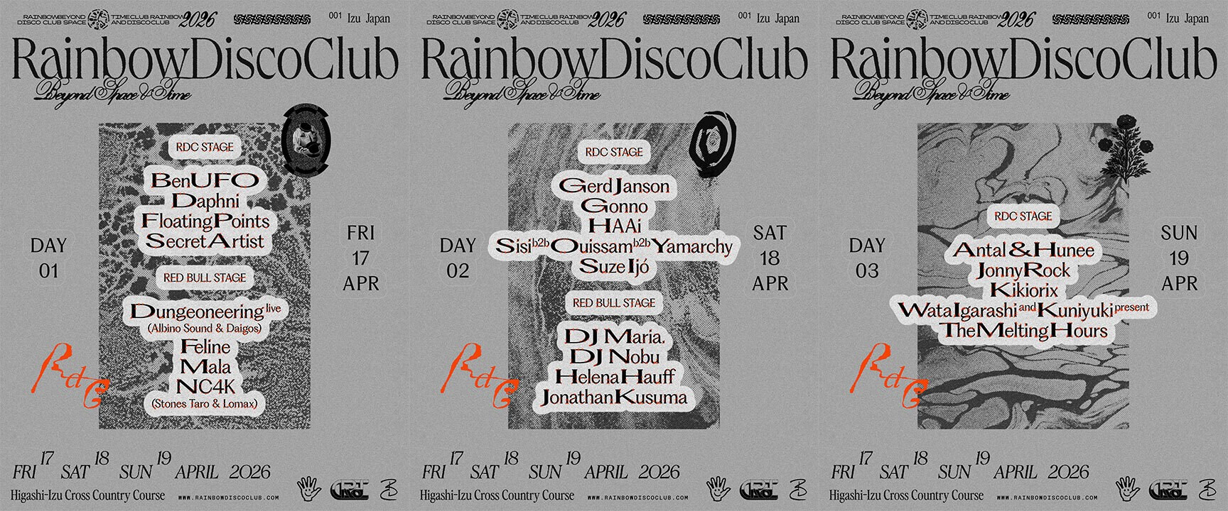 世界中のダンスミュージック・ファンから“信頼できるフェス”として絶大な支持を集める Rainbow Disco Club(RDC) が、2026年4月17日(金)〜19日(日)の3日間、静岡県・東伊豆クロスカントリーコースにて開催される。今年は、過去最大級とも言えるフルラインナップと日割りが発表され、さらにサプライズゲストの存在まで明らかになり、すでにフェスティバル・シーズン最大級の話題を集めている。