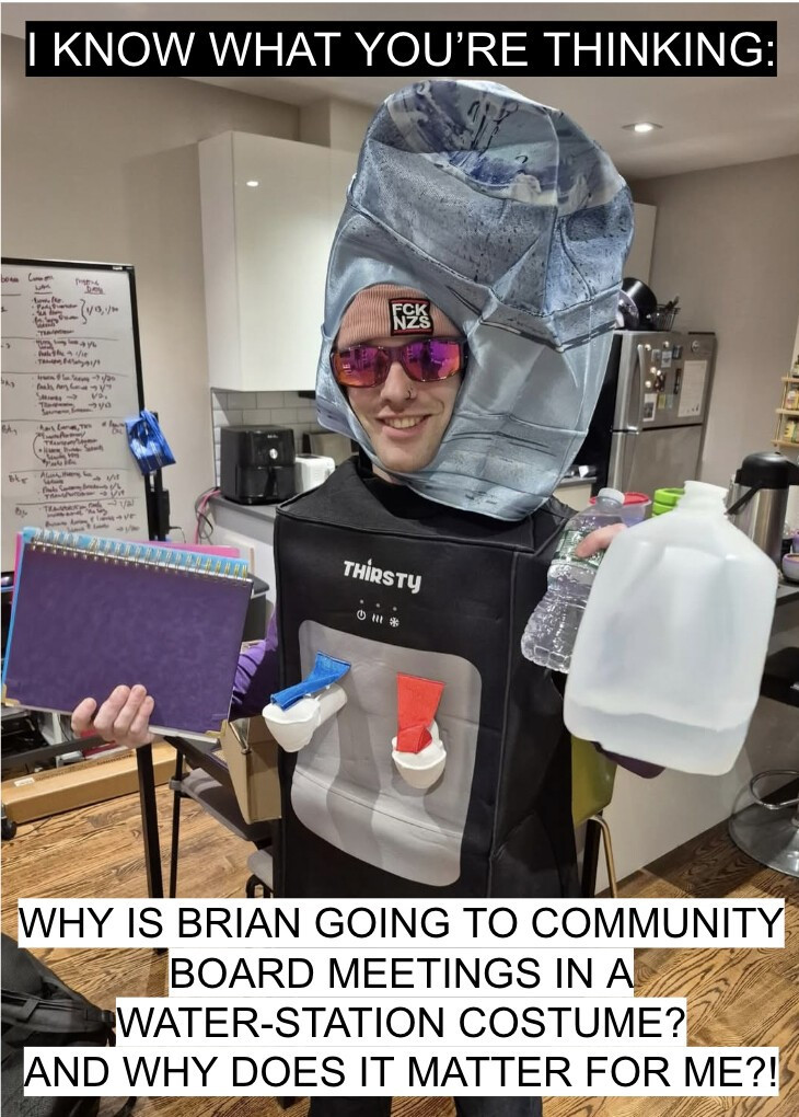 Hackel 氏はこの主張を Change.org での署名活動や、給水所を模した衣装を着て市議会の委員会に出向くパフォーマンスなどを通じて広め、ついにニューヨーク市議会での政策議論にまで持ち込むことに成功している。