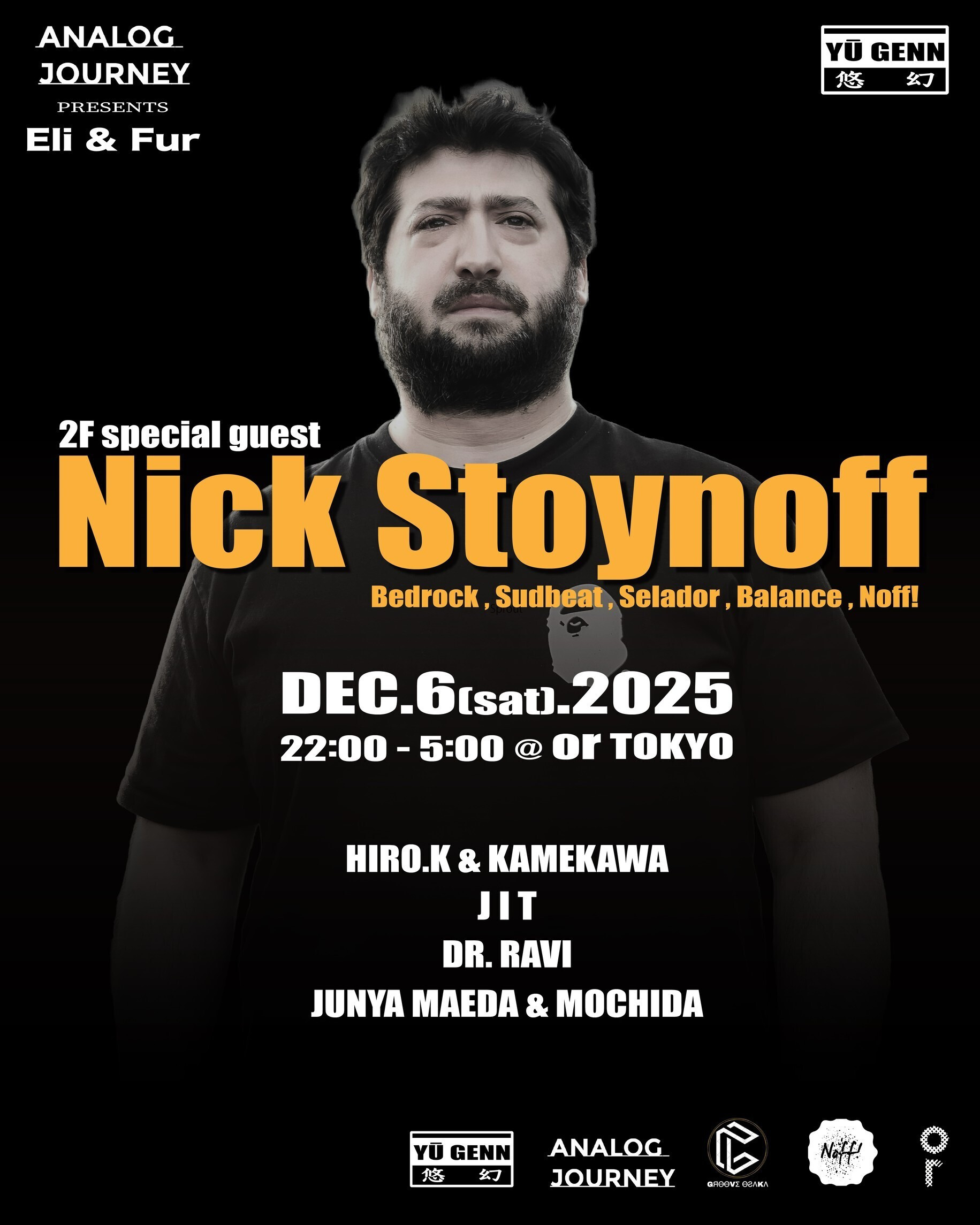 2Fでは、HIRO.K & KAMEKAWAが主宰する人気パーティー「YŪ GENN」がプロデュース。日本のプログレッシブハウスカルチャーを牽引してきた彼らが、この夜に合わせて特別な音旅を演出する。ゲストとして迎えられるのは、シカゴ出身のベテランDJ Nick Stoynoff。