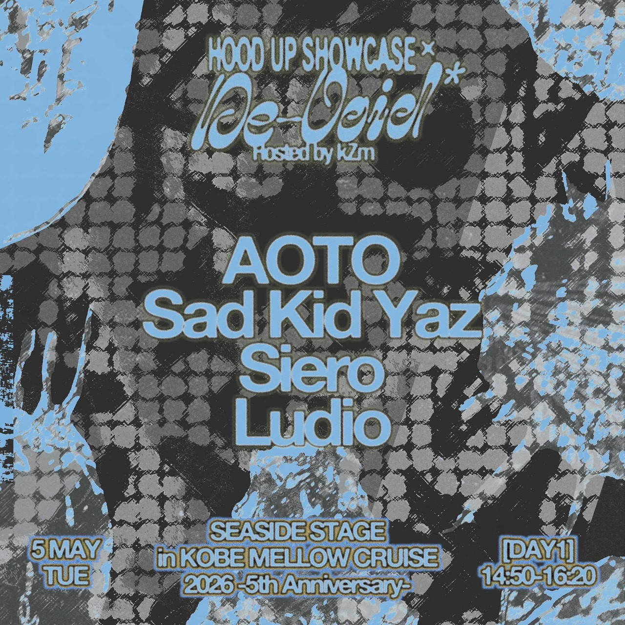 【DAY1】HOSTは、DAY2 HEADLINERでもあるkZm。 自身が主宰するコレクティブ/レーベル「(デヴォイド)De-void*」では、 音楽イベント「Jungle Clash」などを通して アンダーグラウンドとメインストリームの橋渡しとなる活動も展開。 アーティストとしてだけでなく、シーンを横断するキュレーターとしての顔も併せ持つ。 そんな彼のHOOD/拠点である<東京>で、同じく育ち、シーンで輝きを見せている AOTO / Sad Kid Yaz / Siero / Ludio がショーケースで登場する。
