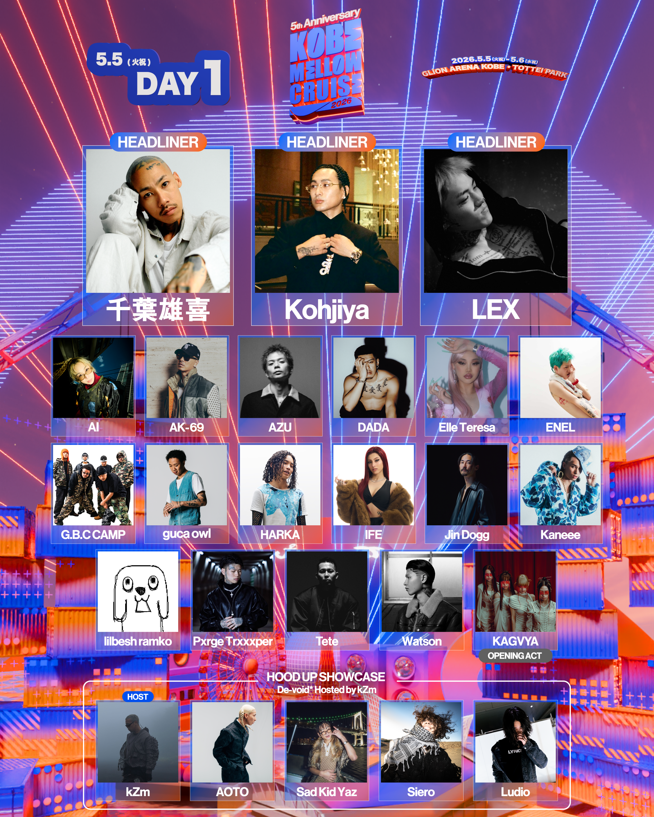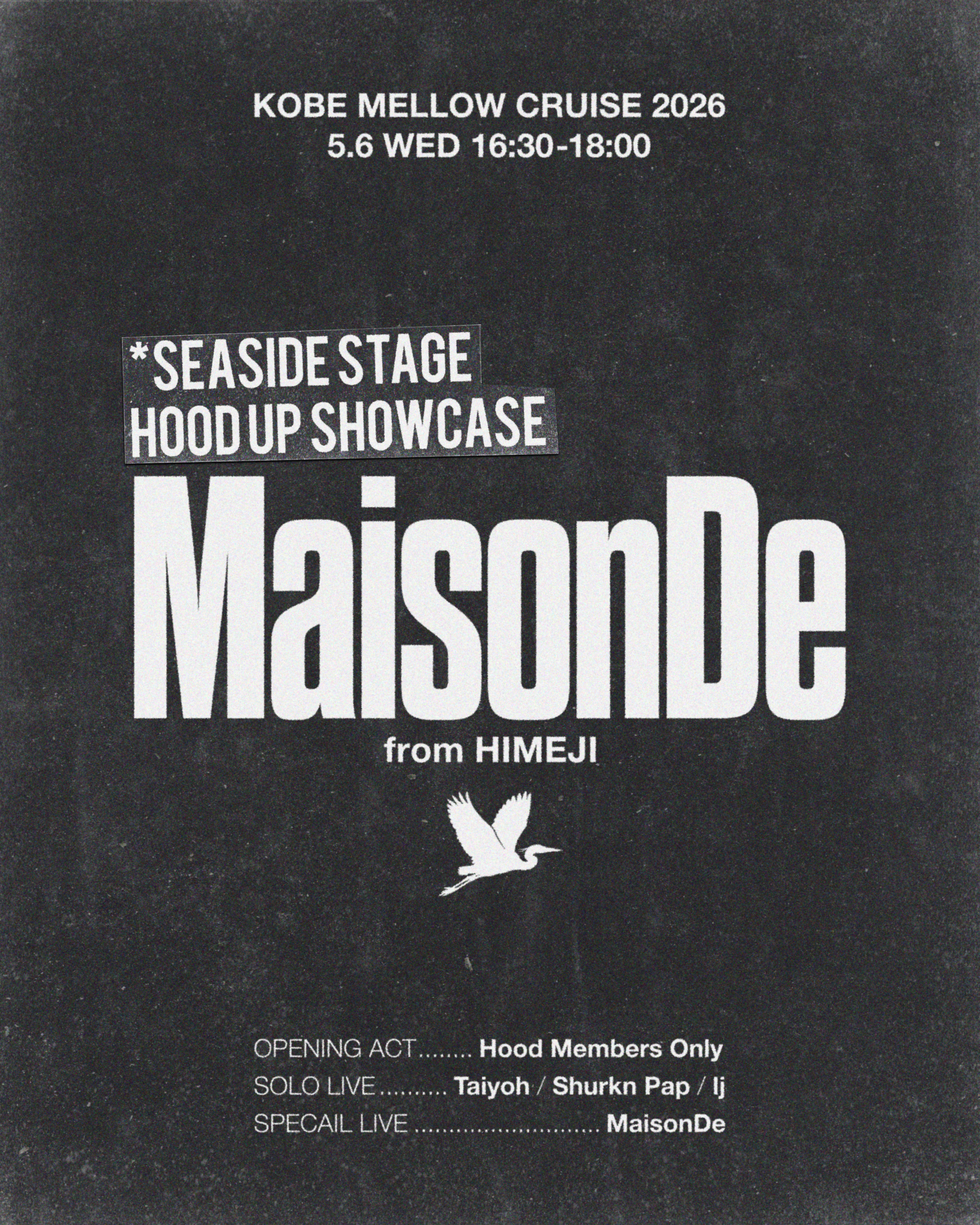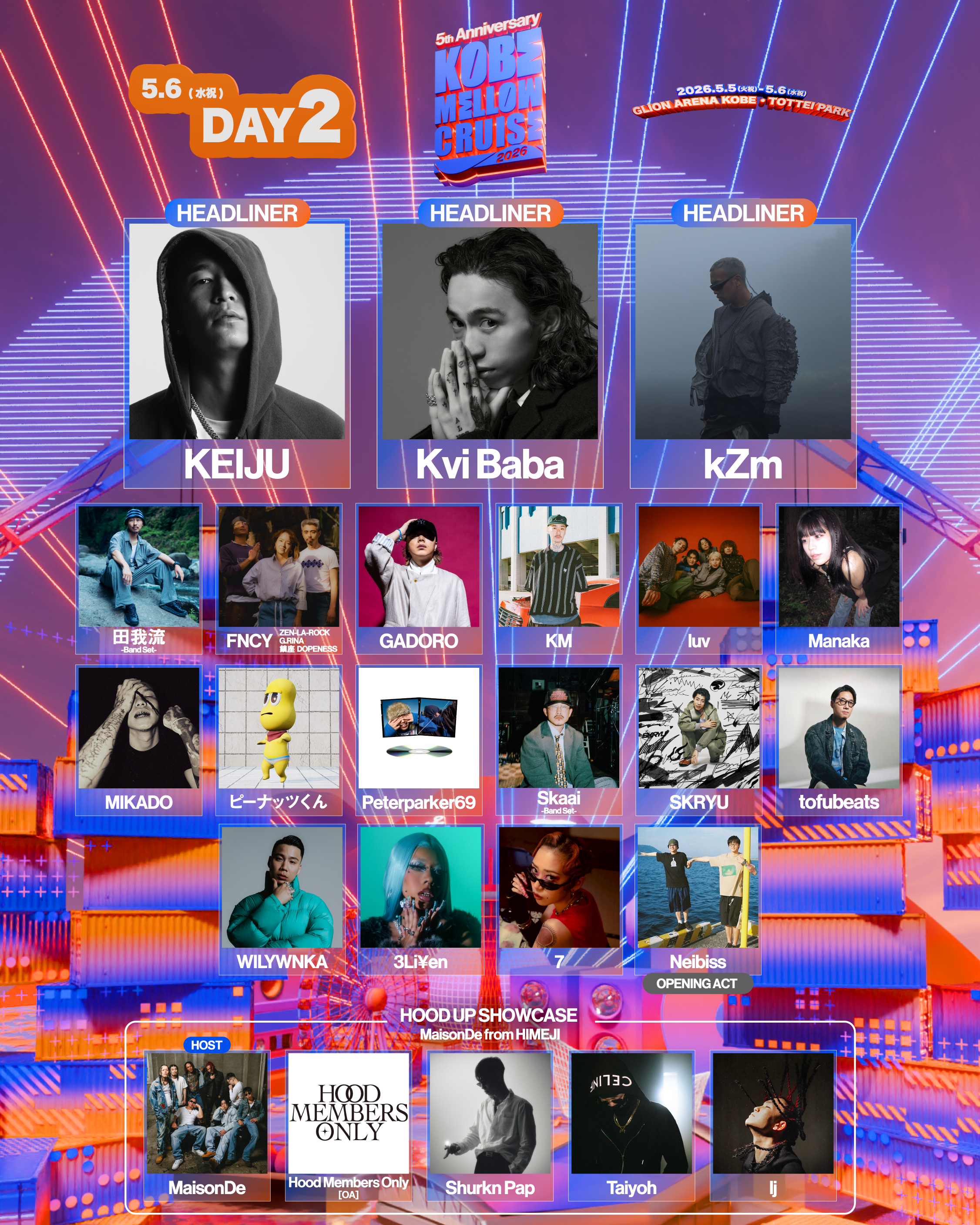「KOBE MELLOW CRUISE 2026-5th Anniversary-」 FINAL LINEUPとして KOBE MELLOW CRUISEとkZm/MaisonDeがお届けする 新企画”HOOD UP SHOWCASE”が始動。 ―HOODが、次のHOODを生む。 HOODの育成/継承/連鎖をライブで体感させる、 次世代フェス・シーンへの入り口を作る本企画は、 「HOOD(地元・コミュニティ)を体現し、 その中で次世代を育てているラッパー」を起点に、 HOOD単位で、そのHOODから生まれたアーティストを フックアップするライブショーケースです。