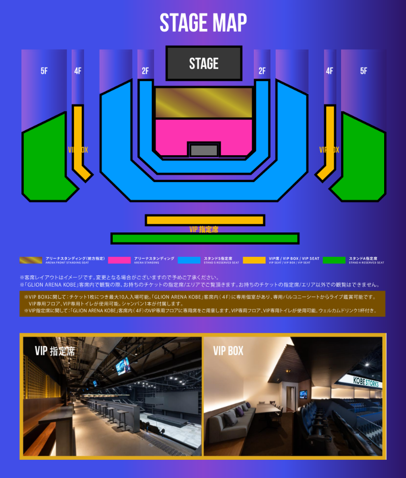 ※VIP BOXに関して:チケット1枚につき最大10人入場可能。「GLION ARENA KOBE」客席内(4F)に専用個室があり、専用バルコニーシートからライブ鑑賞可能です。VIP専用フロア、VIP専用トイレが使用可能。シャンパン1本が付属します。