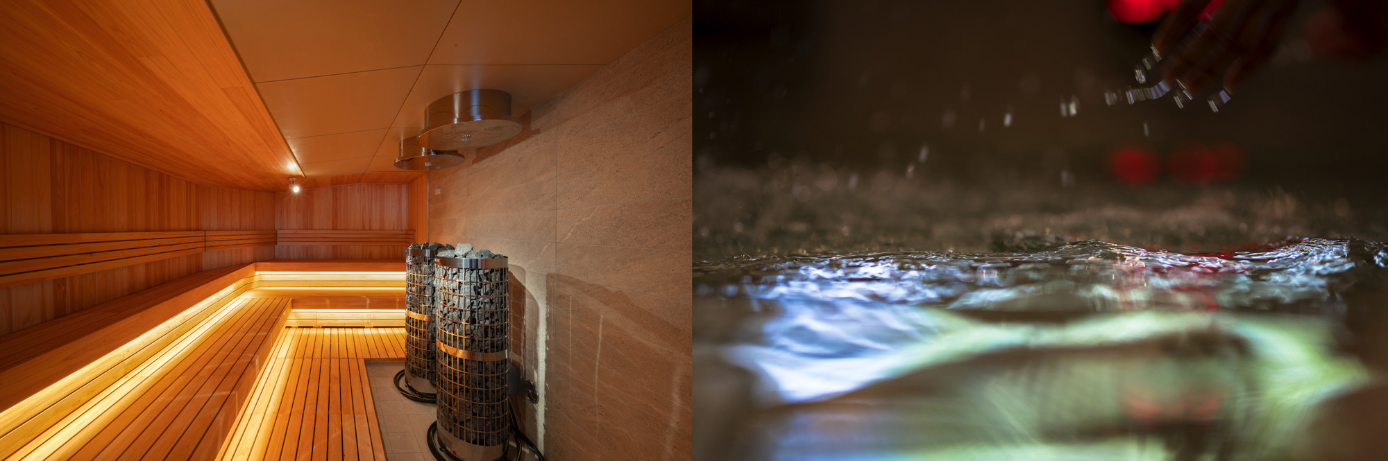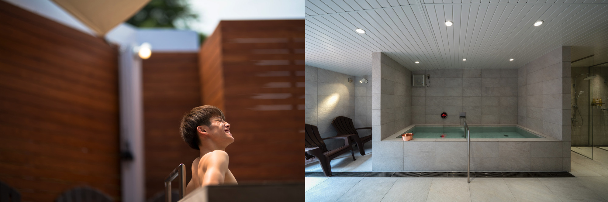 水温や水深の異なる2種類の水風呂、そして広々とした温風呂も完備。天井の高い半外気浴テラスでは、時折聴こえる川の音が山麓のグッドサウンドです。